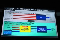 映像回路部は、アンカー・ベイ・テクノロジーズ社製のスケーラーを搭載することで1080pアップコンバートに対応。1080iのハイビジョン放送やDVDなどのSD映像を1080pにアップコンバートしてHDMI出力することが可能だ。なお、本機のHDMI端子は、同社説明員によると「バージョン1.3相当」になっているという。これにより、色信号のビット拡張も実現しているようだ。ただし、前述の通り、ドルビーTrueHDやDTS-HDなど、次世代オーディオフォーマットをHDMIから出力することはできない。またアナログビデオ出力には、アナログ・デバイセズ社製の297MHz/14bitビデオエンコーダーを世界で初めて搭載し、大幅なノイズ低減を実現している。