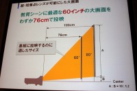 “超・短焦点レンズ”は、同社が従来採用してきたレンズ11枚による構成に新たに大口径の非球面プラスチックレンズ2枚を追加した新開発のレンズ。同社の現行短焦点レンズでは、103cmの距離からの投写で41インチの画面サイズが最大なのに対し、本機では80インチの画面表示が可能だ。また、60インチの表示の場合、投写距離は76cmという短距離を実現している。