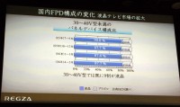 なお新倉氏は、国内・海外の直近のシェアを説明。「国内の4〜7月は12%程度で、3位グループに入ったと認識している。従来は10%も無かったので、REGZAブランドに切り換えた効果があったと考えている。海外では、ドイツでのシェアが5%から9%に上がり、ここでも3位グループに入った。イギリスはまだまだだが、6%のシェアが8%程度に上がった。中国はローカルメーカー対外資という構図が鮮明になっている。当社のシェアは1%程度上がって6.4%となった。特筆すべき点としては、47V型では3割のシェアを占め、1位になったことが挙げられる。アメリカは低迷しており、現在4〜6%程度のシェアだ。総じてREGZA投入以後、シェアは着実に向上している」。