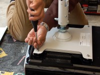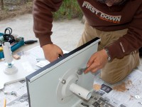 こうした作業には型紙をつくるのが一番だ。前半のハイライトは、天井プレートの4つの穴に、ボードとアルミ板をボルトどめすることだが、紙に書いた図面をそのままあてがい、現物に合わせで進めていく。一方プロジェクター側は底面の足を外して、そこに本体プレートをセット。これで準備作業完である。