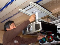 吊り下げは二人がかりだ。まずは天井プレート側をレールにまたがせ、安定を確保しよう。天井とのクリアランスがないので作業は窮屈。そこをクリアできれば半分成功したようなものである。連結アームは360度のフレキシブルになっており、さらに上下で分離できる。HD1本体ごともちあげ、エイヤっとフックを引っかけるようにセットすればOKだ。この位置だとほぼ110インチ投射だが、クロスハッチを出しながら台形歪みが出ないようにチルトを決める。上下80%、左右34%のレンズシフトとズーム&フォーカス調整で入念に追い込んで、いい感じに仕上がった。