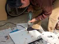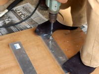 庭先での日曜大工はわくわくする。ボードは白く塗ろう。下から見たときの色あわせだが、HD1本体は精悍なブラックバージョンだ。プロジェクター取りつけ時の総重量は15.6キロ(金具が4キロ)。さほどの重さじゃないが、安全性を考慮してアルミ板2枚(これもコの字型)で補強することにした。専用の天吊り金具「EF-HT11」はよくできている。±15度のチルトや、ぐるっと一周まわせる水平パン機構が付いたスグレモノだ。でもそんな融通性も、土台をしっかり固定したうえでの話である。
