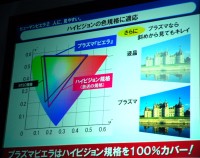 色再現性では、パネル蛍光体の特性をHDTV規格の色域に近づけ、HDTV比100%を実現した。デジタル放送はNTSC規格ではなくHDTV規格で送られてくるので、これに対応した格好だ。