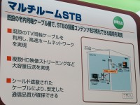 松下電器産業のブースで注目を集めたのが参考出品の「マルチルームSTB」だ。リビングルームに設置したHDD内蔵STBを親機、離れた部屋に設置した通常のSTBを子機として、親機に保存した映像を子機で再生することができるシステムだ。DLNAの技術を応用して開発したという本システムは、親機と子機をLANではなく、TV同軸ケーブルで接続する独自の方式を採用。子機からはEPGを使った録画予約などを行うことも可能だ。なおブース説明員によると、子機機能搭載機は2008年、親機機能搭載機は2009年の発売を目標にしているという。