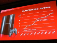 平井氏はPS3の出荷台数を示すグラフを見せ、「海外での立ち上げの遅れなどもあり、正直に言って普及は一気呵成とはいかなかった」と説明。2007年8月末時点での出荷台数は500万台強という。同社は当初、2007年3月末までに600万台出荷を目標としていただけに、目標との乖離が目立っている。ただし平井氏は、2008年3月末までに1,100万台を出荷するという従来からの目標について、「自信を持っていけるんじゃないかと思う」と、今後の販売増に自信を見せた。