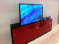 展示されたのは記者発表会(関連記事)で公開された各モデル。コントラスト10万対1、厚さ20mmという次世代のスペックに加え、従来の常識にとらわれない設置方法が目を惹く。屏風スタイルやガラスへの設置、ラックに収納するデザインなど、薄型化による様々な可能性を提案している。