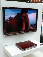 現行液晶テレビの展示も大々的に行われている。画質にこだわった“THXモデル”や最上位のGXシリーズをはじめ、全ラインナップを一堂に展示した。中でも目を引くのが、3色のカラーバリエーションのDSシリーズに、同じく3色のBDレコーダーを組み合わせた展示だ。テレビ/レコーダーを赤でそろえたシステムなどは、かなり印象的だ。