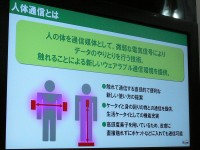 本技術を応用することにより、携帯電話をポケットに入れたまま人と握手するだけでデータ交換ができたり、特定スポットに体の一部が触れた際、周辺情報やクーポンを取得することも可能になるという。また、「Bluetoothや赤外線などの通信と違い狭い範囲で通信を行うため、情報漏洩リスクも低くなる」(同ブース説明員)という。