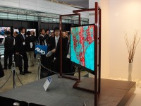 先日のCEATECでも公開された超薄型液晶パネルの展示に注目が集まる。本機は、52型で最薄部20mmを実現。今回は屏風タイプの参考モデルが展示された。