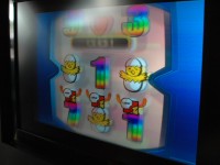 ブースに設けられた暗室では、最新技術として「大型3Dモニター」と「ハイブリッドモニター」のデモを行う。大型3Dモニターは、リアプロジェクションの画面に液晶パネルを重ねることで立体表示を実現する技術。前面、後面で、明るさの異なる同一の映像を表示することで、任意の奥行き位置を表現することが可能となっている。