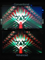 またハイブリッドモニターは、液晶パネルの光源に、独自の光学設計技術を適用した単一光源システムを採用することで、高コントラストな映像表現を可能にしたディスプレイ。液晶パネルの変更特性に最適な、単一偏光の光源を採用することにより800万対1のコントラスト比を実現できるという。また、光源にはマイクロディスプレイが組み込まれており、2表示素子駆動を行うことで、2倍の階調性を実現しているという。