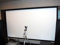 最初にSpyderTVのソフトをパソコンにインストールした。次にマニュアルに従い調整環境のセットアップを行った。スクリーンの前にセンサーを設置しなければならないので、センタースピーカーを移動し、三脚を立ててアタッチメントでセンサーを固定してスクリーンから30cm離れたところにセンサーをセッティングした。センサーとパソコンは付属のUSBケーブルで繋いだ。また、テストパターン用のDVDをBDプレーヤーに挿入しプロジェクターのウォーミングアップがてらSpyderTVの解説(英語)のチャプターを再生した。ウォーミングアップ時間は約20分必要とマニュアルに書かれている。