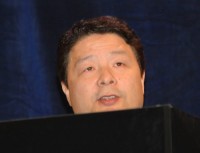 最初に登壇したのは北米法人の社長を務める山田喜彦氏。同氏は、パナソニックが北京オリンピックの公式パートナーであることを紹介し、VIERAが同大会の公式HDTVに選ばれたこと、またカメラなど放送機器も多数納入していることなどを説明した。