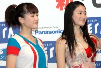 ふたりともCMで着用した衣装で舞台に現れた。白を基調に赤をアクセントにしたカプリパンツルックは「アクティブなイメージで作っていただきました」(小雪さん)、赤・青・白のストライプTシャツは「スポーティーな感じです」(綾瀬さん)という。