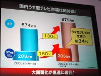 国内の薄型テレビ市場は拡大傾向にあり、JEITAの調べによる2007年度の国内薄型テレビ総販売台数は879万台と、前年度の674万台から130%の成長を遂げた。中でも37V型以上のモデルの成長は顕著で、2006年度より150%増の303万台を売り上げ、2007年度は薄型テレビ市場全体の約34%を占めたという。
