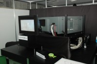 普通のテレビカメラでは撮影不可能な、遮蔽物で隠れた被写体を撮影するための特殊な電波カメラを展示。今回は擬似的に発生させた霧の向こうにある被写体を撮影する実験が公開されている。