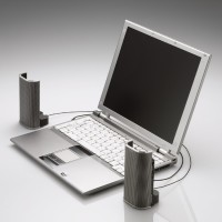 両製品とも普通の2chスピーカーシステムとして使用するだけでなく、左右のスピーカーを一体化して試聴することができるユニークなスピーカーシステム。一体化した際には、スピーカー本体内にケーブルが収納でき、サイズは幅64×奥行57×高さ112mmとコンパクトになるため、持ち運びにも適している。