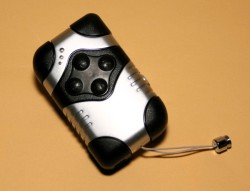 「CRANKING MP3 PLAYER」(定価:6,980円)はクランクハンドルによって人力発電を可能にするオーディオプレイヤー。1GBメモリを内蔵し、外部メモリは使えない。再生コントロールは前面の4つのボタンのうち3つで操作するのだが、MP4と異なり、液晶ディスプレイを持たないため、アルバムごとの再生などはできない。楽曲は1曲先送り、戻りだけで選択することになる。