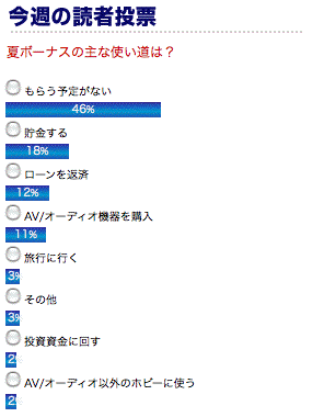 最近の節約志向を受けてか、「貯金」と「ローン返済」で半数以上を占めました。次いで、「AV/オーディオ機器を購入する」と答えた方が22%。「旅行」以下を大きく引き離して3位につけたのは、当サイトならではの傾向と言えるでしょう。毎日の生活に潤いを与えるのは、やっぱり趣味。せっかくのボーナス、上手に良い買い物をしたいものですね。