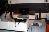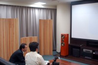 より細やかな説明と体験が可能な事前予約制のシアタールームも備える。同ルームは、プロジェクター「DLA-HD100」(製品DB)やスピーカーシステム「SX-L77」(製品DB)などでシステムを構築。また、カーテンも遮光性の高い黒地のものをあえて使用しないなど、「一般家庭と同じような環境で製品に触れてもらうことを考えた」(同社説明員)という作りになっている。