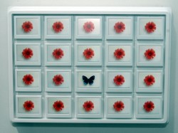 セイコーエプソンでも3D技術を展示。こちらは8月に発表のあった8視点方式を採用したもので、会場には2.57V型のパネルのほか、同技術の活用法提案のひとつとして蝶や花を3D表示するデジタル標本箱を展示している。
