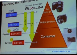 カシオアメリカ デジタルイメージングのバイス・プレジデントであるWilliam Heuer氏は、ハイスピード技術を紹介。独自技術をコンパクトサイズのカメラでも、そしてカードサイズのカメラでも楽しめるようになった今回の新モデル「EX-FC100」「EX-FS10」が持つ魅力を語った。