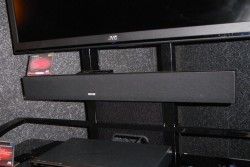 フロント、センターを担うサウンドバー、サブウーファー、ブルーレイプレーヤーの3ピースのホームシアターシステムだ。左右のフロントスピーカーは、3インチウーファーと1/2インチトゥイーターの2ウェイ2スピーカー。センタースピーカーは3インチウーファー1基を搭載する。8インチウーファーを有するサブウーファーとの接続はワイヤレスで、設置の幅が広がる。アンプ駆動はフロント、センター部が30W、サブウーファーが100W。