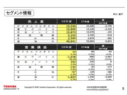 サブプライムローン問題に端を発する世界経済の悪化に伴う市場の収縮と、急激な半導体の価格下落の影響を受け、半導体事業が大幅に減益。電子デバイス部門は昨年度比2,430億円のマイナスで、デジタルプロダクツ部門も2,746億円のマイナスとしている。