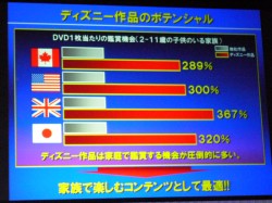 ここで高橋氏は世界各地でのディズニー作品の視聴傾向についても言及。2-11歳の子供がいる家庭におけるDVD1枚あたりの鑑賞機会が、他社作品に比べてアメリカで300%、日本では320%、イギリスでは367%という高い頻度となっていることを説明し、同社の作品が、家族で観られる機会が圧倒的に多いことを説明。ディズニー作品は家族で楽しむコンテンツとして最適であるとアピールした。
