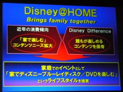 高橋氏は昨今の世界的な不況に触れ、「クッキング・トイやニンテンドーWii、デジタルフォトフレームなど、いわゆる“家ナカ(いえなか)”と言われる、家で楽しむコンテンツの人気は拡大傾向にある」と消費動向に言及。こうした現状を受け「Disney @ HOME Brings FAMILY TOGETHER」という戦略を掲げマーケットを育成、拡大していくと発表した。