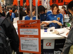 FIFAワールドカップのオフィシャルパートナーであるソニーならではの、サッカーをテーマにしたブースでは、25日に発表されたばかりの最新デジタルカメラ“Cyber-Shot”「DSC-HX1」のタッチ&トライコーナーが設けられたほか、デジタル一眼“αシリーズ”の「貸し出しコーナー」(会場内限定 1回1時間)を設置して、自由にソニーのカメラが体験できる展示が人気を集めている。同じく25日に発表されたばかりの新製品であるデジタルフォトプリンター「DPP-FP97」も出展されている。