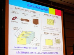BDの今後の進化として考えられるのはさらなる高解像度化を行う4K2K対応、もう一つは3D対応だが、宮井氏は「パナソニックの見解としては、まず3D表示拡張をすすめるのが適正と考える」とコメント。その理由として、「4K2Kの場合、映画の24pの映像の場合は現在の4倍の容量が必要になる。60pのものだと、実にデータ量は8倍になる。それに対して3D表示では、フルHD解像度の場合でもHDTVの2倍のデータ量で済み、50GBの現行BDで対応できる」と説明した。なお、パナソニックでは3D映像の方法として、フルHD映像を右眼、左目の2ch分用意するフレームシーケンシャル表示を本命に開発を行っている。この方式だと、左右片目あたりの情報量は1,920×1,080のフルHDとなる。