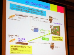 つまり実際の製品では、HDMI 1.4で3D対応BDプレーヤーと対応テレビを接続すると、3Dフォーマットを自動認識し、自動的にそのフォーマットに合致した表示方法に切り替わるということになる。ただし、「HDMIの規格化と同時にBDの規格化も進めないと、この自動認識が働かず、ユーザーにとって使いづらいものになる」とし、BDの3D規格早期策定が必要であることを強調した。