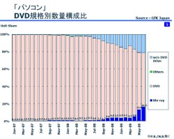 また、併せてパソコンにおけるBD対応機のシェアについても発表。BD対応パソコンの国内パソコン市場における6月度の販売台数のシェアが、過去最高の16.3%(前年同月0.7%)を記録したことを明らかにした。