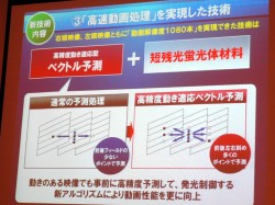 高速動画処理技術では、右眼用と左眼映像ともに動画解像度1,080本が必要である点に言及。従来のプラズマでは、3Dの高速表示において動画解像度が落ちてしまうという課題があったとし、大きな動きのある映像でも事前に高精度予測して発光制御する新アルゴリズム「高精度動き適応ベクトル予測」と、前述の短残光蛍光体により3Dに対応した新プラズマパネルの開発に成功したことを説明した。