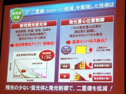 そして二重像低減については、残光の少ない蛍光体「新短残光蛍光体」を開発したと発表。新材料の開発により残光時間を従来比3分の1にしたという。この蛍光体と合わせて、パネル発光重心位置を適応型に制御し、残光の少ないパネル発光を可能にする技術を用いることで、二重像の低減に成功したと解説した。