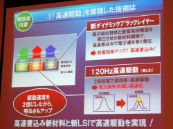 佐藤氏は高速駆動技術について、「フルHD 3Dの映像信号は120Hzでも60Hz駆動時とパネルの明るさを同じにする必要がある」とコメント。この課題をクリアするため、電子放出特性と壁電保持機能を両立させ、放電効率の向上と高速書き込みを可能にした「新ダイナミックブラックレイヤー」と、2回放電で高効率かつ高速起動を可能にした120Hz駆動の新LSIを新たに開発したと説明した。