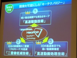 技術のさらなる詳細については、パナソニック AVCネットワークス社 主席技監の佐藤陽一氏が説明。フルHD 3D再生には高速かつ明るいパネルが必要だったと語り、同社のNeo PDP eco技術に基づく「高速駆動技術」「二重像低減技術」「高速動画処理技術」という3つの新技術が3D開発を可能にしたと説明した。