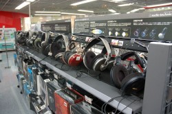 2階は携帯電話やデジタルカメラのほか、ピュアオーディオ機器やヘッドホン、オーディオアクセサリー類なども展開。ヘッドホンは5〜10万円クラスの高額製品も多数取りそろえているほか、オーディオについてもリスニングルームが用意されているため、実際に音質を確認することができる。また、ケーブルやプラグ、インシュレーターなどオーディオアクセサリー類のラインナップもかなり豊富だ。
