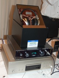 デノンブースで一番の目玉は、2008年に発売されたフラグシップ機「AH-D7000」。φ50mmドライバーを搭載したダイナミック型ヘッドホンで、振動板にはマイクロファイバーを採用。さらに、振動板の後ろに放射される音圧の一部を音響フィルターを通して放射させることで、振動板前後の音圧バランスを調整して最適な音響特性を生み出す「アコースティックオプティマイザー」も搭載している。同社のCDプレーヤー「DCD-1650SE」などと組み合わせた試聴システムでは、持参のCDを熱心に聞き比べる来場者の姿が見られた。