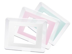 着せ替えフレームはホワイト、ミントブルー、パステルピンクの3種類を用意。またスタンドの取り付け方法により、縦置き、横置きの両方に対応。背面の壁掛け穴で壁掛けも可能だ。
