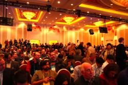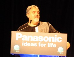 カンファレンス冒頭では、国際中継にて大阪からパナソニック(株)社長の大坪文雄氏が挨拶を行った。今回発表となった3Dビデオカメラを自ら手に持って紹介し、パナソニックが3Dにおけるエンド・ツー・エンドを担っていく上での意気込みを語った。