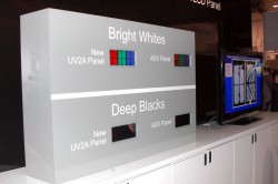 また、実機の展示とともに行われているのが、各種搭載技術の実力をアピールするデモ。240Hz駆動技術「AquoMotion 240」の実力を120Hz駆動機と比較したり、UV2Aパネルによる白の明るさと黒の沈み方の進化を解説するコーナーを設けるなどしている。