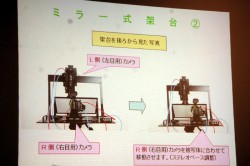 この問題をクリアするため、毎日映画社では3D撮影機器を自社開発した。具体的には、視差を自由に調整できるレールにカメラ2台を固定した「並行式架台」と、ハーフミラーを使って視差を最短0cmまで調整できる「ミラー式架台」を主に利用している。被写体との距離が変わるのに合わせて、リアルタイムで2台のカメラのあいだの距離を変えていけば、より自由で自然な3D映像が撮影できるという。