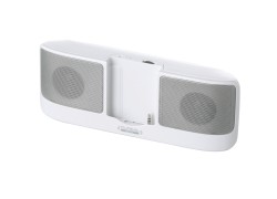 価格は税込で3,875円。ホワイトとブラックの2色がラインナップする。スピーカー本体に左右へスライドする3.5mmのステレオミニプラグを搭載したことで、様々なタイプのiPodとの接続に対応している。スピーカーの口径は38mm、総合出力は4W。本体には外部入力も設けており、iPod以外のポータブルオーディオプレーヤー等を接続して楽しむこともできる。