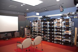 AVアンプ比較試聴スペースがあるのは「メカリア」という名前の視聴室。ここには国内の全メーカーの製品が展示されており、もちろんすべて視聴することができる。現時点でデノン/Integra/オンキヨー/ソニー/パイオニア/ヤマハ/マランツ/パナソニックの全39機種がスタンバイしており、新製品が発売されるごとに入れ替えを行い、HDMI端子搭載の現行ラインナップすべてをここで視聴できるようにする。ラックには最大42台まで格納できるようになっているという(製品ラインナップ一覧)。