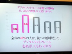 イベントの冒頭では、同社がデジタルフォトフレームや母の日を取り巻く状況を説明。母の日がある5月は、クリスマスに次いでギフト需要が高まり2,377億円もの経済効果があることや、デジタルフォトフレームの販売台数が年々増えて2010年には170万台に達する見込みであること、そして親へのプレゼントとして全体の約40パーセントがデジタルフォトフレームを検討しても良いと答えた独自調査結果などを紹介した。
