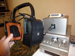 さらに同社は、手持ちのヘッドホン/イヤホンを利用しながら、高調波成分を顔に放射させる製品「BATPURE-C」も出展。アンプやオーディオプレーヤーからの出力を、ヘッドホンとBATPURE-Cにパラレル接続して使用する。