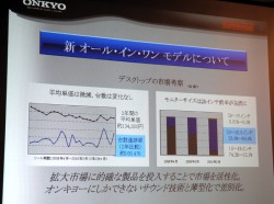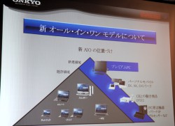 同社では一体型PCの市場が伸びていること、地上デジタルへの完全移行が迫っていることを背景に、これまでオンキヨーが参入していなかった新領域の製品として本機を企画。「プレミアム・オールインワン」がコンセプトで、「テレビ機能を中心にしながら、お客様の『音をもっと良くして欲しい』という要望に応えるべく、音質にこだわってオンキヨーの特質を出した。新しい試みでPCとしての価値を上げていく」(同社常務取締役 PCカンパニー社長の菅正雄氏)という。
