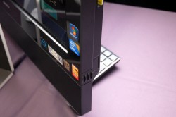 さらに、本体右側面には収納式のiPodドックも装備。iPodの充電はもちろん、PCを起動していないときには、ドックにiPodを接続した上で、左側のMODEボタンで切り替えることで、本機をiPodドックスピーカーとして使用することも可能となっている。ただしiPodデジタル接続には対応しない。さらにHDMI入力端子も備え、外部ディスプレイとして本機を利用することもできる。